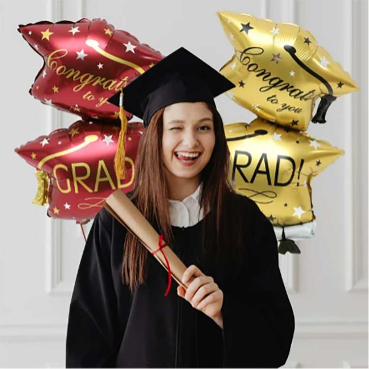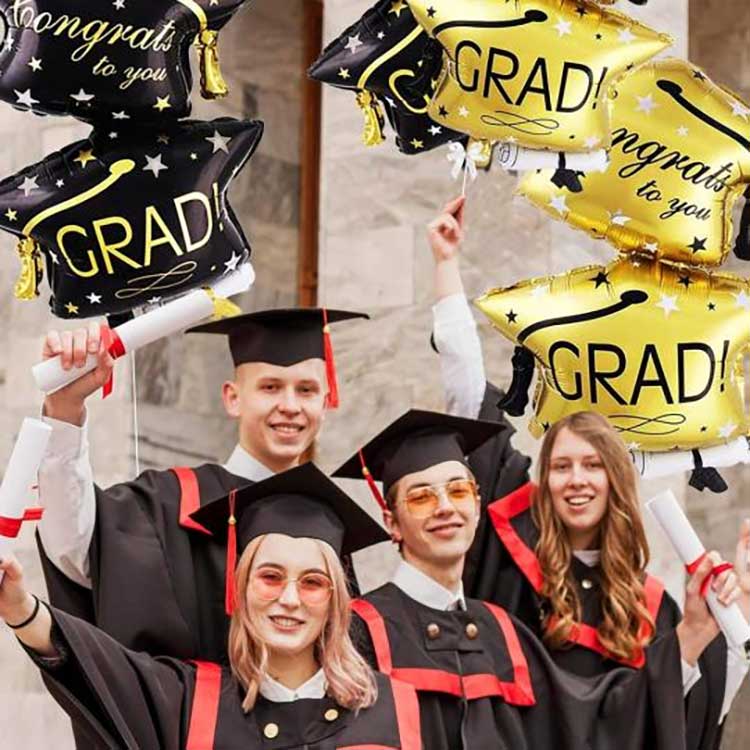 Notre ensemble de ballons pour casquette de remise de diplôme de 32 pouces est fabriqué à partir d'un film PET aluminisé de haute qualité de 18 microns d'épaisseur. Ce film a une excellente élasticité, se gonfle complètement et est moelleux, et résiste à la compression et aux chocs, parfait pour les écoles et lieux similaires. Nous utilisons des encres respectueuses de l’environnement pour l’impression, ce qui donne des couleurs vives et uniformes qui résistent à la décoloration. Même après des heures d’exposition directe au soleil, comme lors des cérémonies de remise des diplômes en plein air, les motifs et les couleurs restent toujours aussi éclatants.