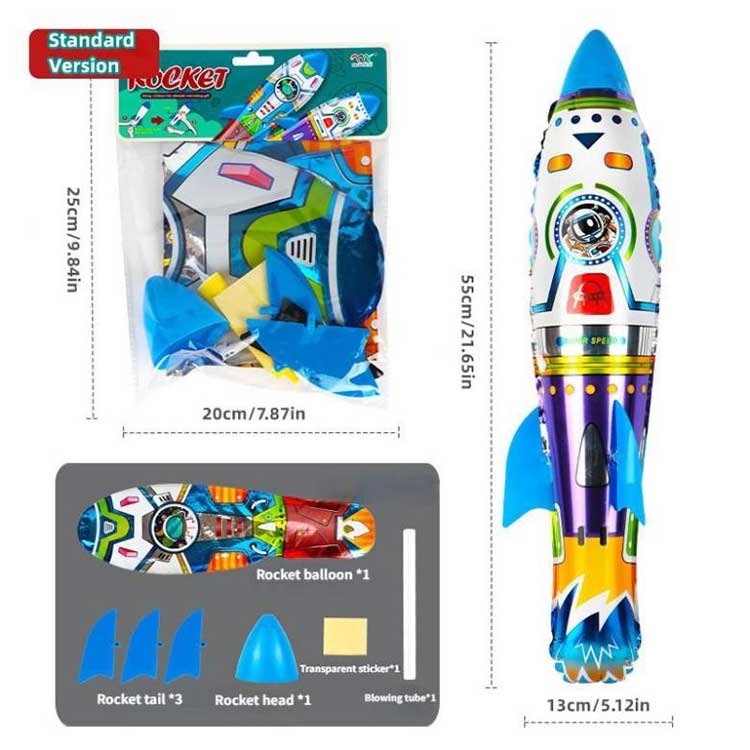 L'emballage du ballon gonflable en aluminium de fusée 3D est un sac en carton soigné et bien rangé, ce qui lui donne une belle apparence, que vous l'utilisiez vous-même ou que vous l'offriez en cadeau. Les accessoires à l'intérieur sont également très complets : 1 corps de ballon fusée, 3 pattes de fusée, 1 tête de fusée, plus 1 paille ou pompe à air (au choix), et 4 planches d'autocollants.