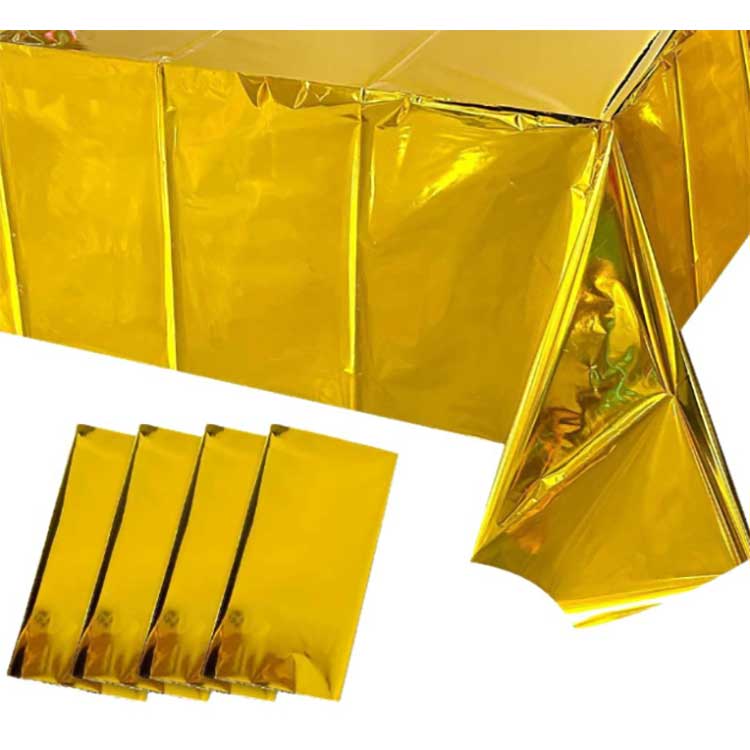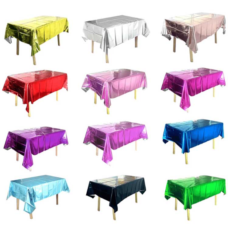 La nappe en aluminium est utilisée pour dresser la table lors de diverses célébrations. Cela peut empêcher la surface de la table des taches, des rayures ou des dommages, et les couleurs et les motifs peuvent également apporter des effets décoratifs. Il est constitué d'un film spécial PET recouvert d'aluminium. Au cours du processus de fabrication, nous avons utilisé la technologie de revêtement sous vide pour garantir la résistance, la ténacité et les performances anti-âge du revêtement de table. De plus, ses molécules de haute densité peuvent empêcher efficacement la pénétration des taches de soupe ou d'huile, et elles ont également une fonction imperméable.
