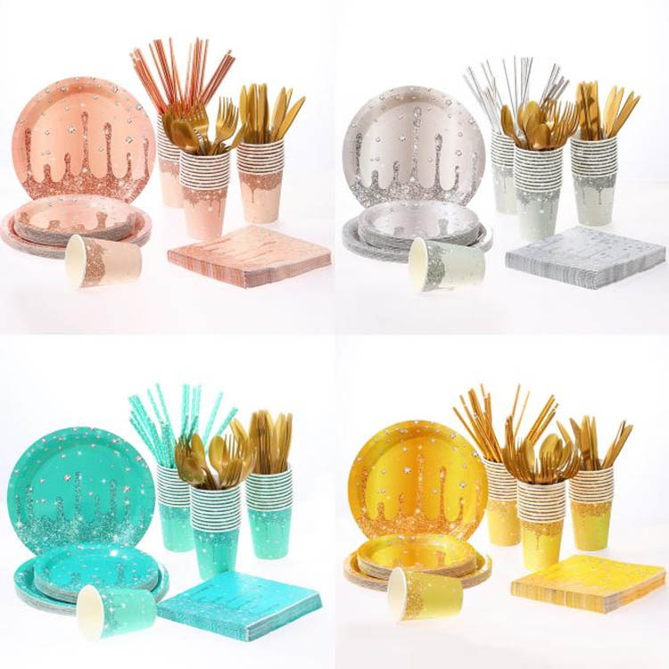 Ensemble de plaque en papier de fête d'or en feuille d'ora différentes couleurs et différents emballages. Les clients peuvent choisir en fonction de leurs besoins. Les accessoires de produits à l'intérieur sont très pratiques. L'emballage est disponible dans des sacs OPP ou des sacs d'emballage personnalisés pour répondre à différents besoins.