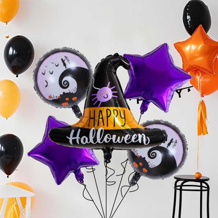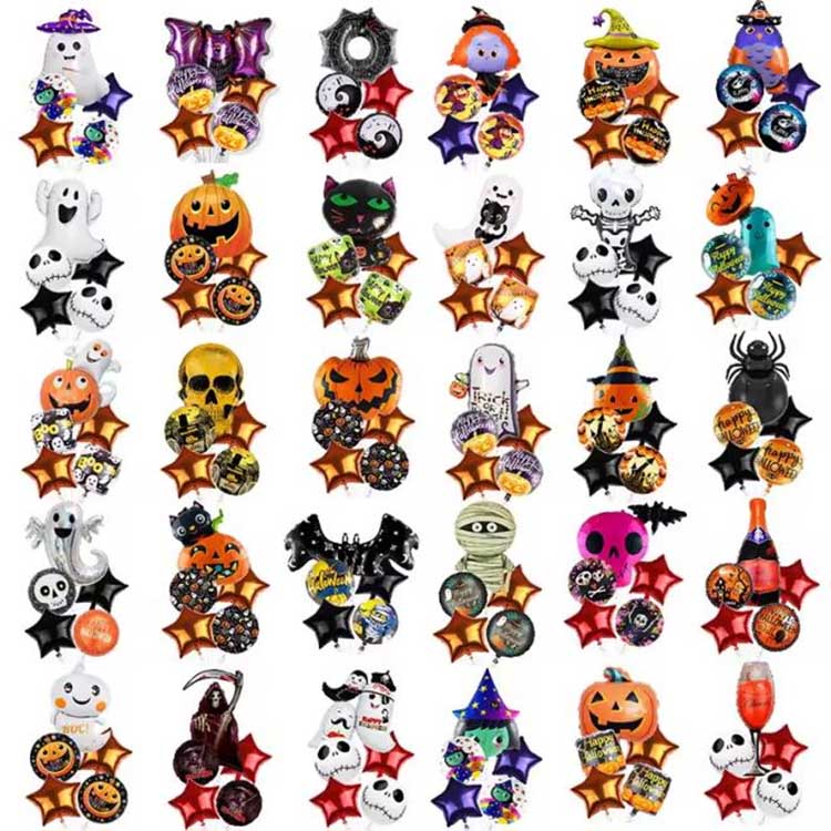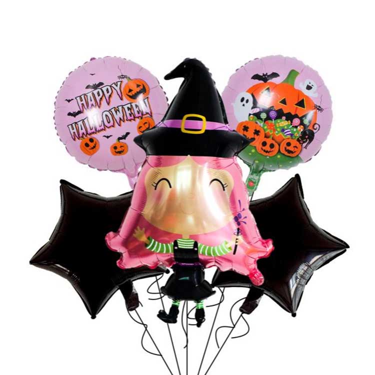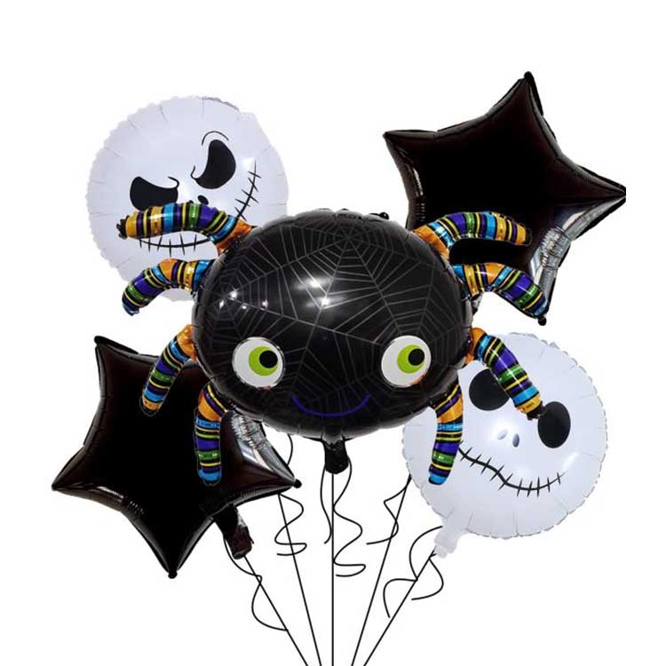 Un ensemble de cinq pièces pour Halloween est un ensemble de ballons spécialement conçu pour Halloween. Il se compose généralement de ballons en aluminium, de ballons en latex et d'autres accessoires. Il comprend cinq types de ballons au total ! Chaque ensemble présente un motif ou un personnage qui correspond parfaitement au thème d'Halloween. Parfaits pour les décorations d'Halloween, vous pouvez même remplir les ballons d'hélium pour les faire flotter ! Cela intensifie vraiment l’atmosphère mystérieuse d’Halloween !