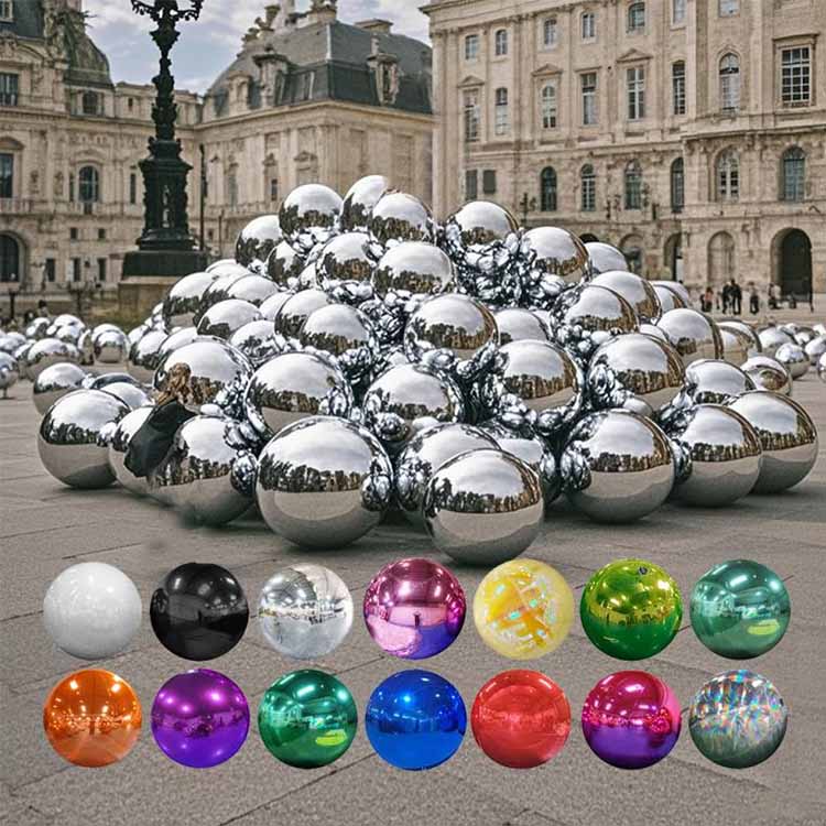 Sphères gonflables en PVC à surface miroir avec surfaces réfléchissantes, disponibles en différentes tailles et couleurs.