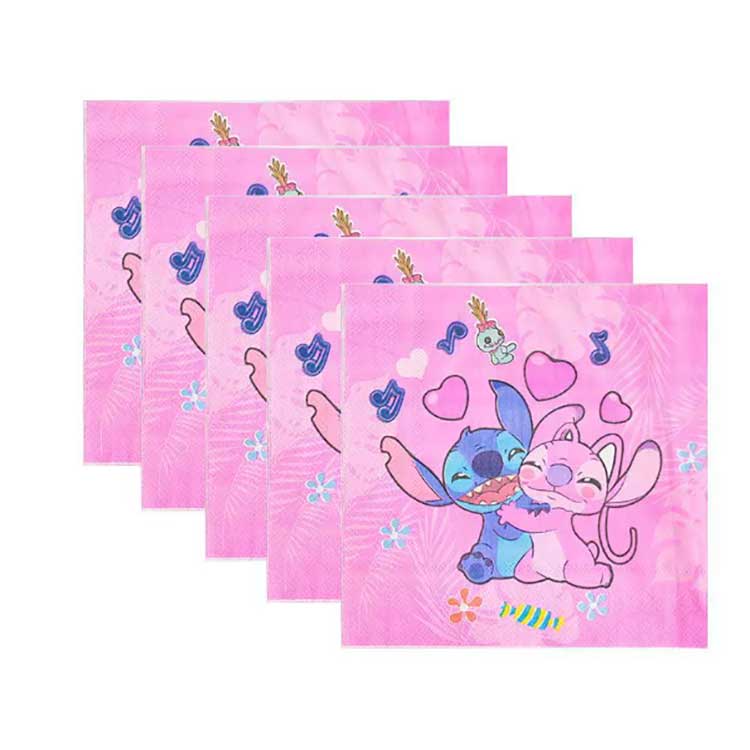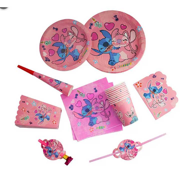 Un ensemble d'assiettes jetables Stitch comprend les produits suivants : assiettes de 7 pouces (10 pièces/sac), assiettes de 9 pouces (10 pièces/sac), serviettes (20 pièces/sac), fanions (10 pièces/sac), sacs cadeaux de retour (10 pièces/sac), boîtes de pop-corn (6 pièces/sac), dragons soufflants (6 pièces/sac), chapeaux en papier (6 pièces/sac), gobelets en papier (10 pièces/sac), cornes (6 pièces/sac), pailles. (10 pièces/sac), cartes d'invitation (10 pièces/sac), masques (10 pièces/sac), cuillères, couverts (10 pièces/sac) et nappe (1 pièce/sac). L'ensemble contient 17 types de produits différents. Les clients peuvent choisir d'acheter l'ensemble complet ou de sélectionner seulement une partie des articles pour répondre à leurs besoins.